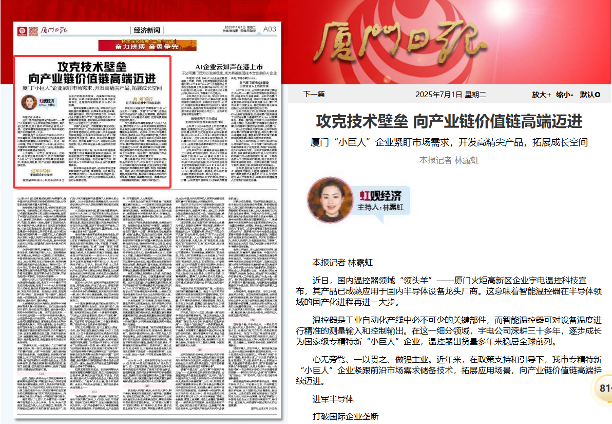 7月1日,《廈門(mén)日?qǐng)?bào)》在報(bào)道宇電新突破的頭條報(bào)道中提到,國(guó)內(nèi)溫控領(lǐng)域“領(lǐng)頭羊”宇電的產(chǎn)品已成熟應(yīng)用于國(guó)內(nèi)半導(dǎo)體設(shè)備龍頭廠(chǎng)商。這意味著智能溫控器在半導(dǎo)體領(lǐng)域的國(guó)產(chǎn)化進(jìn)程再進(jìn)一大步。以下是發(fā)表全文和版面:攻克技術(shù)壁壘 向產(chǎn)業(yè)鏈價(jià)值鏈高端邁進(jìn)廈門(mén)“小巨人”企業(yè)緊盯市場(chǎng)需求,開(kāi)發(fā)高精尖產(chǎn)品,拓展成長(zhǎng)空間本報(bào)記者 林露虹 近日,國(guó)內(nèi)溫控器領(lǐng)域“領(lǐng)頭羊”——廈門(mén)火炬高新區(qū)企業(yè)宇電溫控科技宣布,其產(chǎn)品已成熟應(yīng)用于國(guó)內(nèi)半導(dǎo)體設(shè)備龍頭廠(chǎng)商。這意味著智能溫控器在半導(dǎo)體領(lǐng)域的國(guó)產(chǎn)化進(jìn)程再進(jìn)一大步?! 乜仄魇枪I(yè)自動(dòng)化產(chǎn)線(xiàn)中必不可少的關(guān)鍵部件,而智能溫控器可對(duì)設(shè)備溫度進(jìn)行精準(zhǔn)的測(cè)量輸入和控制輸出。在這一細(xì)分領(lǐng)域,宇電公司深耕三十多年,逐步成長(zhǎng)為國(guó)家級(jí)專(zhuān)精特新“小巨人”企業(yè),溫控器出貨量多年來(lái)穩(wěn)居全球前列。 心無(wú)旁騖、一以貫之、做強(qiáng)主業(yè)。近年來(lái),在政策支持和引導(dǎo)下,我市專(zhuān)精特新“小巨人”企業(yè)緊跟前沿市場(chǎng)需求儲(chǔ)