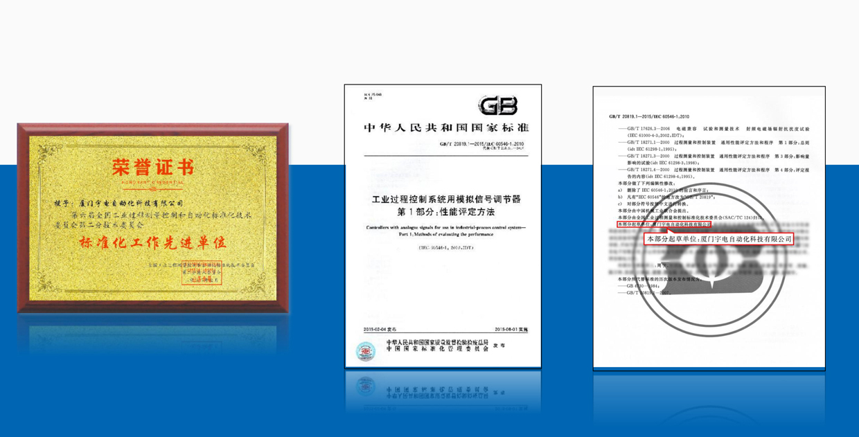 宇電積極參與國家標準制定工作,主持起草了《GB/T 20819.1-2015 工業(yè)過程控制系統(tǒng)模擬信號調節(jié)器》標準,該標準為溫控器調節(jié)器最主要的國家標準;并參與《溫度測量設備電子數(shù)據(jù)交換用屬性列表》等50多項國家標準制定。