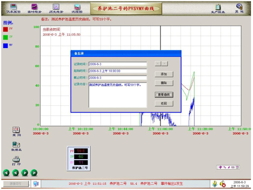 11、點擊“儀表畫面”、“實時趨勢圖”、“歷史趨勢圖有報表選項”。查看數(shù)據(jù)曲線、報表??呻S時打印實時、歷史8個數(shù)據(jù)曲線圖表