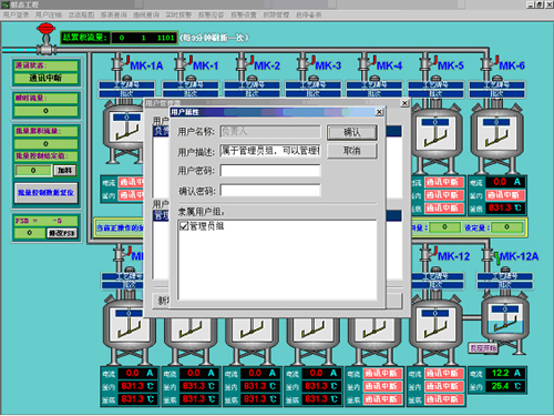 整個(gè)系統(tǒng)主要由一臺(tái)AI-708H控制14個(gè)反應(yīng)釜的批量進(jìn)料,分別由7臺(tái)AI-704M和7臺(tái)AI-501精確測(cè)量反應(yīng)釜的溫度和電機(jī)的電流,所有這些都在主控PC上進(jìn)行控制和顯示,并由軟件記錄并保存數(shù)據(jù)。