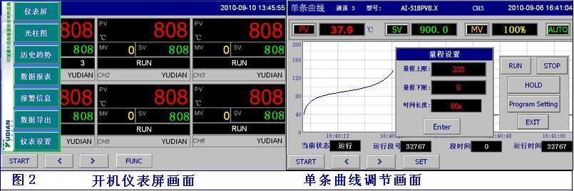 1、數(shù)據(jù)采集及控制:軟件系統(tǒng)從工業(yè)現(xiàn)場溫度控制器采集測量值,編輯實時曲線,可同時顯示8條實時曲線,用顏色來區(qū)別。曲線顯示可選百分比與實時曲線2種圖。也可屏蔽其他曲線,顯示單條曲線。呈現(xiàn)的實時數(shù)據(jù),并存入系統(tǒng)內(nèi)數(shù)據(jù)庫,以便日后數(shù)據(jù)查詢等使用。在流程圖、實時趨勢圖或儀表畫面上: