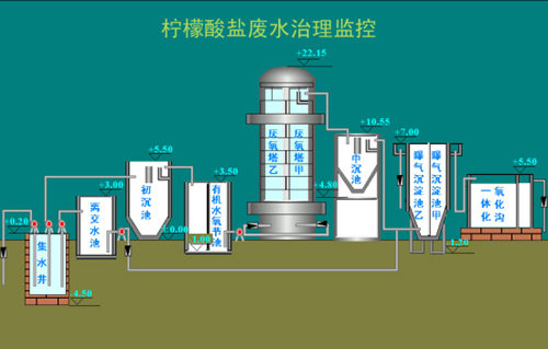 宜興協(xié)聯(lián)檸檬酸廢水處理廠采用厭氧加好氧處理工藝,其中好氧部分采用SBR法處理。SBR是處理高濃度有機(jī)廢水的理想途徑之一。一期設(shè)計(jì)日處理100立方/小時,設(shè)2座爆氣池2座厭氧塔,氧化溝,有機(jī)調(diào)節(jié)池等12座處理池。控制設(shè)備布置分散,要求實(shí)現(xiàn)總線型遠(yuǎn)程檢測控制。